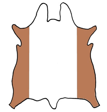 Esta é a área premium da pele com a menor quantidade de defeitos. É a parte mais grossa e mais firme, de espessura consistente, é mais adequada para itens que exigem estiramento mínimo e máxima firmeza.